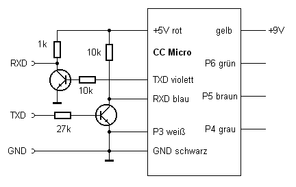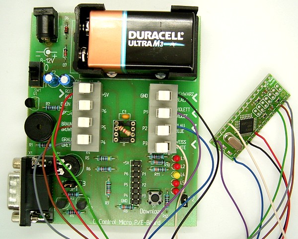 Die Stromversorgung kommt von außen über eine 9-V-Batterie. Wichtig ist noch, dass P3 (weiß) mit an Masse liegt. Beim Einschalten weiß der Controller dann, dass zuerst ein neues Programm übertragen werden soll. Nach der fertigen Übertragung aus der CC-Basic-Umgebung wird das Programm automatisch gestartet, auch wenn P3 weiterhin an Masse liegt. Hier könnte man zwar auch einen Tastschalter einfügen, aber mit fester Masseverbindung reicht es für die ersten Versuche auch schon. Die noch freien Ports P4, P5 und P6 wurden an die Eingänge RI, CTS und DSR der RS232 gelegt, damit ich ihren Zustand am PC überwachen kann.