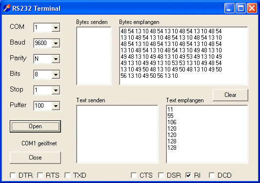 Das Ergebnis kann nun mit meinem Terminal.exe überprüft werden. Im Anzeigefenster sieht man die eintreffenden Messergebnisse. Weil die Eingangsspannung gleichzeitig an RI liegt, zeigt das Programm einen 1-Pegel.