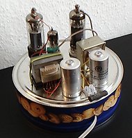 Eigentlich ist der V2 jetzt fertig. Zwar wissen wir nicht, wie der originale V2 damals geklungen hat, aber wir sind vollauf zufrieden. Wir haben uns vorgenommen, die elektrische Sicherheit zu verbessern, damit auch der Herr vom VDE wieder gut schlafen kann. Und außerdem muss noch ein Gehäuse besorgt werden. Wir haben schon intensiv nach kleinen, gebrauchten Lederkoffern gesucht. Nur sind die leider alle zu schmal. Da müssten wir uns von der Keksdose trennen und ein völlig neues Chassis bauen. Aber wollen wird das? Eigentlich sind wir inzwischen zu dem Schluss gekommen, dass eine Keksdose immer schon das ideale Chassis für einen Röhrenverstärker war.