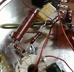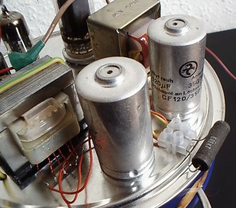 Für die weitere Entwicklung liehen wir uns einen alten Oszillographen und einen Sinusgenerator. Der Verstärker bekam einen Lastwiderstand von 6,8 Ohm am Ausgang. Dort konnte man dann die Ausgangsspannung messen. Dann wurde dies und das ausprobiert. Zuerst schalteten wird jeweils 2,7 kOhm parallel zu den alten Kathodenwiderständen. Damit steigt schon mal der Anodenstrom der Röhren. Da das noch nicht reichte, wurde noch jeweils ein Elko mit 47 Mikrofarad parallel gelegt. Das Ergebnis: Wesentlich mehr Verstärkung und Ausgangsleistung. Und weil es so gut lief, wurden gleich noch die Widerstände an den Schirmgittern verkleinert, 390 Ohm für die PL504 und 68 Ohm für die PL36. Ergebnis: Noch mehr Power.