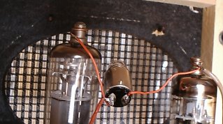Der Hochtöner aus der Box musste weichen, um dem Verstärker Platz zu machen. Das erwies sich jedoch nicht als Nachteil, sondern eher als Vorteil. Das Gerät hat nun einen satten Klang und betont besonders die Bässe. Außerdem kann man nun durch die Stoffbespannung hindurch das Glühen der Röhren sehen. Und nicht nur die Kathoden, sondern auch eine große Glimmlampe, die als Aussteuerungsanzeige eingebaut wurde.