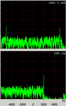 RTL DRM-2 auf 5990 kHz: Beim Betrieb ohne Vorselektion trifft zufällig ein sehr starker kommerzieller Digitalsender bei 6900 kHz auf die Spiegelfrequenz. Zieht man die Empfangsfrequenz um 2 kHz nach oben, erscheint das DRM-Spektrum bei 10 kHz, während das Spiegelsignal aus dem Nutzsignal herauswandert. Im Bild sieht man das etwas 2 kHz breite Signal der störenden Spiegelfrequenz. In dieser Einstellung erhält man of ein wesentlich besseres SNR und weniger Aussetzer.