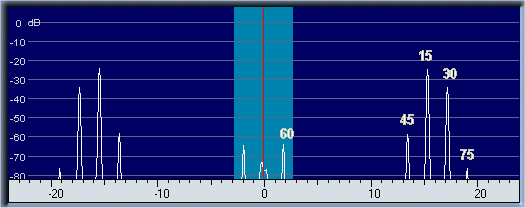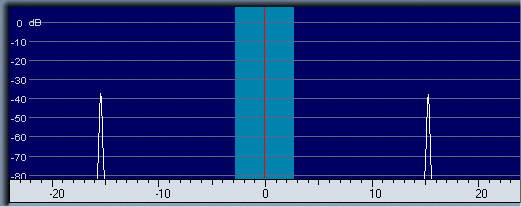 Schließt man nun dieses Stereo-Signal an einen Line-Eingang der Soundkarte an, ist zu erkennen, ob die Soundkarte ein steilflankiges Tiefpassfilter besitzt und ob sie ein echtes Stereo-Signal verarbeitet. Der Test verwendet das SDRadio. Eine gute Soundkarte zeigt nur zwei Signale, das Wunschsignal bei + 15 kHz und das abgeschwächte Spiegelsignal bei -15 kHz.