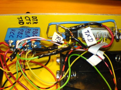 Es wurde ein Modul selbst gebaut, mit dem Vorteil, auch PB0 bis PB2 zu nutzen. Als Multiplexer dient ein einfacher 4xUM-Schalter. Hier werden PB0,PB1,PB2 und VCC umgeschaltet zwischen RS232 und Steckboard/Batterie