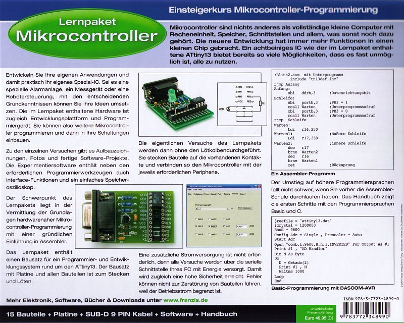 Entwickeln Sie Ihre eigenen Anwendungen und damit praktisch Ihr eigenes Spezial-IC. Sei es eine spezielle Alarmanlage, ein Messgerät oder eine Robotersteuerung, mit den entscheidenden Grundkenntnissen können Sie Ihre Ideen umsetzen. Die im Lernpaket enthaltene Hardware ist zugleich Entwicklungsplattform und Programmiergerät. Sie können also weitere Mirkocontroller programmieren und dann in Ihre Schaltungen einbauen.