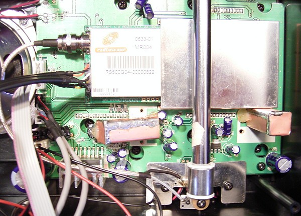 Intern arbeitet übrigens das schon im letzten Jahr vorgestellte RS500 Multi-Standard Digital Radio Module von RadioScape mit einem Mehrband-Frontend und einem DSP. Die Abtastfrequenz beträgt 8,192 MHz für DAB und FM und 3,072 MHz für AM und DRM. Aber wie das genau funktioniert und was genau in den HF-Stufen verwendet wird, ist noch unbekannt. Interessant ist allerdings, dass offenbar auch AM- und FM-Signale über den DSP dekodiert werden. Von außen konnte nur festgestellt werden, dass in den AM-Bereichen ein breites Filter und eine wirksame ALC eingesetzt wird. Die ALC reagiert in einem Bereich von +/-25 kHz um die Empfangsfrequenz. Das Modul liefert auch eine Abstimmspannung für die Kapazitätsdiode am Ferritstab.