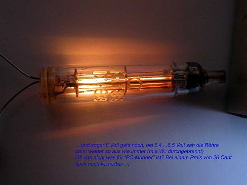 Nachtrag: Mit dem 0V2 hatte ich etwas Pech. Nachdem ich wie erwähnt das Gerät am "Blitzwandler" getestet hatte, sollte er einen Ehrenplatz bekommen. Tja, und als ich den Wandler wieder anschließen wollte (ohne Batterie, versteht sich), habe ich dummerweise zuerst den Stecker für die Heizspannung gesteckt - tja, und der Stecker für die Anodenspannung baumelte gegen das Gehäuse. Da gab es einen "Drillingsblitz" und alle 3 Röhren waren im Elektronikhimmel. So ein Kondensator hat jede Menge Energie! Naja, ich hab's bereit repariert und draus gelernt: immer erst die Masse anschließen... Bei 26 Cent/Röhre war es ja nur ein kleiner Verlust :-) Und hier noch ein Test zur Heizspannungsgrenze der 1SH18b: