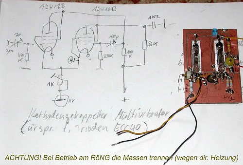 Da Sie sich ja auch sehr intensiv mit den russischen Röhren befassen, möchte ich Ihnen anhand eines kleinen fremdsteuerbaren Multivibs eine alternative Montagemethode für die Röhren vorstellen Eine weitere Idee habe ich noch nicht realisiert: eine so hergestellte Platine kann ja auch einen Sockel darstellen, der dann in eine Steckleiste eingesetzt werden kann (Platinenstecker wie bei PC-Karten) Die Ausschnitte wurden mit einer kleinen Trennscheibe hergestellt, die Leiterbahnen sind gefräst (nicht schön aber praktisch und schnell für Einzelstücke:-) ).