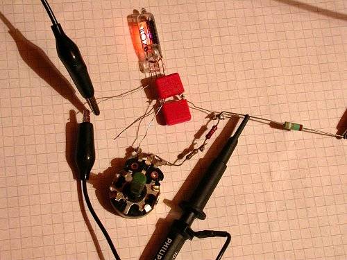 Nachtrag von J.H.: Ja es scheint so zu sein, dass diese Röhre in etwa einem Thyristor entspricht, d.h. wenn bei anliegender Betriebsspannung (also unter der Zündspannung) ein kurzer positiver Impuls auf das Gitter1 gegeben wird, dann zündet dass System und die Löschung erfolgt nach Unterschreiten der Brennspannung (oder bei Wechselspannungen nach jeder positiven Halbwelle). Nachdem ich einmal wusste, dass es ein "Kaltkathoden Thyratron" ist, habe ich im Netz auch noch einige Info's gefunden, leider durchweg für andere Röhrentypen. Unklar ist mir die Funktion des G2. Entweder ist es eine weitere Zündelektrode - oder vielleicht kann man damit auch das Thyratron löschen. Jedenfalls scheint es andere Typen zu geben, die eine Löschelektrode haben.