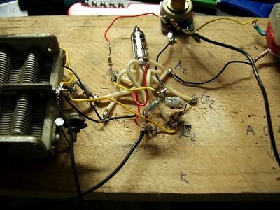 Nebenbei habe ich mir mit Batterieröhren auch einen 0V2 gebaut (1SH24B in Audion und Endstufe, 1SH18B in Treiberstufe). Eine solche Empfindlichkeit und Selektivität hätte ich nie erwartet, bei dem geringen Aufwand! An einer Aussenantenne habe ich auf MW mehr als 40 Stationen gezählt, daneben ist noch das 160m-Amateurband zu empfangen, natürlich auch SSB und CW ....ein mittels Potiachse, Schwunggewicht und Resten einer CD-Vorratspackung mit 3 alten Zeitschriften-CDs (zur Versteifung) hergestellte Untersetzung macht's möglich...60mal muss man den Abstimmknopf für die 180Grad des Drehkos drehen, also insgesamt eine Untersetzung von 1:120 ! Der Aufbau ist aber noch nach der herkömmlichen Methode, soll auch nur zeigen, dass Sie nicht alleine sind ;-)