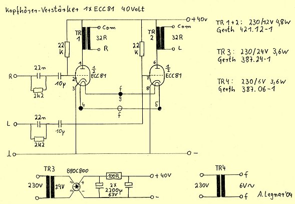 Angeregt durch Ihren Artikel in Elektor 9/2003 hab ich dann auch gebastelt. Die modifizierte Schaltung entspricht weitgehend der aus Elektor 9/2003 auf Seite 42, bzw. der gleichen aus dem Buch „Röhren-Projekte von 6 bis 60 V“ auf Seite 62. Ich habe sehr viele Netz-Trafo´s als Ausgangs-Trafo ausprobiert und natürlich auch höhere Anodenspannungen. Für letztere nehme man eine kleinen Trafo mit 24V sekundär, richte gleich und siebe gründlich: Trafo 24V/3,6VA, B80C800, 2200µF/63V, Siebwiederstand 100R 1/2W, und noch mal 2200µF/63V. Da bei einem solch geringen Strombedarf, wie sie die ECC81 in diesem Fall hat, praktisch die volle Leelaufspannung des Trafos zur Verfügung steht, liegt an der Anode ca. 40 Volt an. Für die Heizspannung wird lediglich ein Trafo mit 6V/300mA benötigt. Die Wechselspannung liegt parallel an den beiden Heizungen der Trioden ( Pin 4 und 5 gebrückt ).