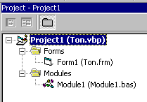 In Visual Basic kann OutPort als Sub (Prozedur) eingebunden werden, InPort dagegen muß eine Funktion sein. Die einzelnen Elemente einer DLL werden mit dem DECLARE-Befehl angegeben. Damit die Datenübergabe zwischen Visual Basic und der DLL richtig funktioniert, müssen alle Übergabeparameter ByVal deklariert werden, d.h. als Wert im Gegensatz zur Übergabe einer Referenz-Adresse. Unter dem 32-Bit-Betriebssystem Windows95/98 muß bei der Deklaration die Großschreibung beachtet werden. In der DLL wurden alle Funktionen nur mit Großbuchstaben bezeichnet, was nun auch bei der Bezeichnung im aufrufenden Programm eingehalten werden muß. Die Deklarationen müssen sich in einem eigenen Modul (hier: Module1.bas) befinden, das in das Projekt TON eingebunden wird.