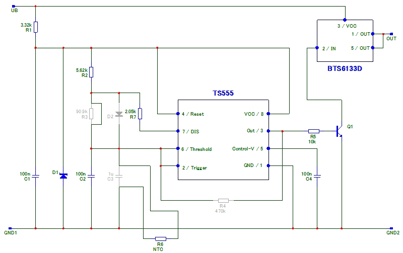 BTS6233 = Highside-Treiber an dessen Ausgang „out“ der Lüfter o.ä. angeschlossen werden kann.