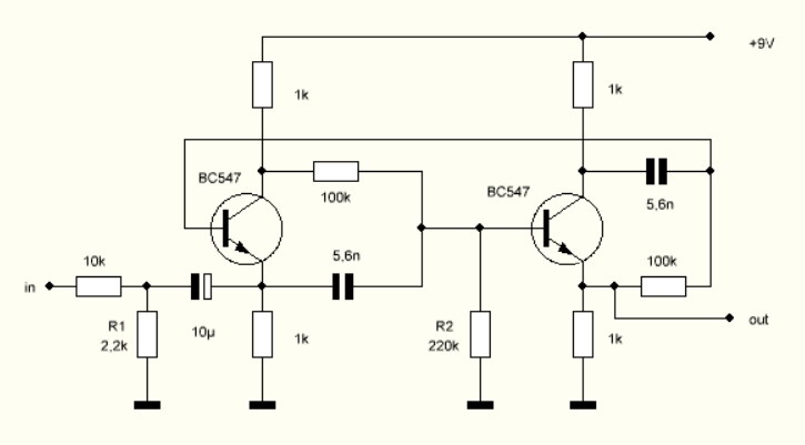 1, sodass das Filter eine geringe Güte hat. Das wird durch R1 mit 2,2 k