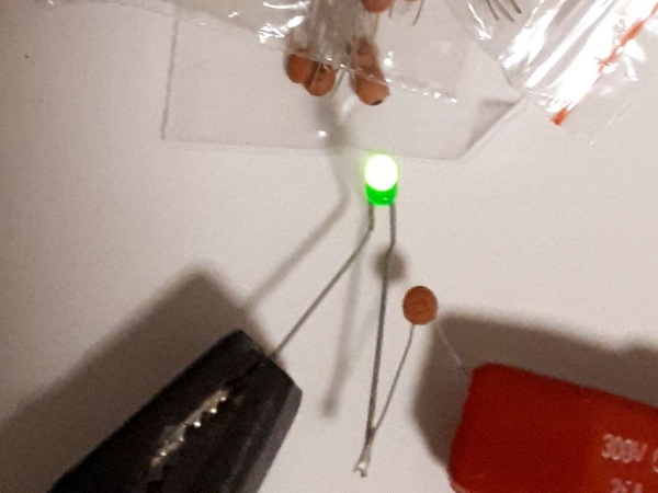 grüne LED in Reihe geschaltet. Am Widerstand mit 22 kOhm blieb nur noch