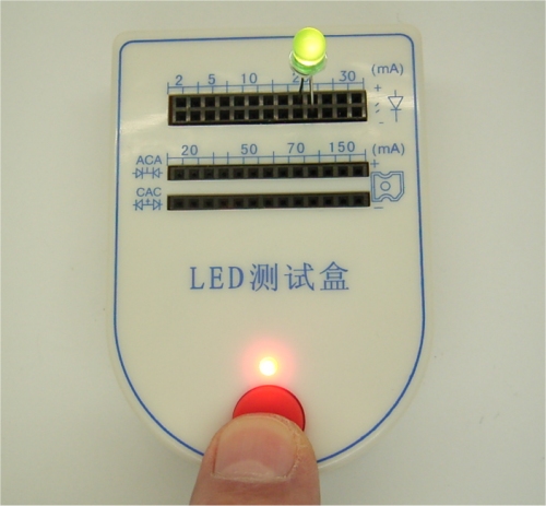Wenn man in China beim Großhändler so um die 100.000 LEDs kauft kann es passieren, dass man einen LED-Tester gratis dazu bekommt. Eckhard Koch (siehe auch: Tecsun PL-310) hat mir einen mitgebracht. Was da wohl drin ist? Vielleicht irgendein ausgeklügeltes IC? Weit gefehlt: aufgeschraubt, nachgesehen, drin sind eine 9-V-Batterie und ein ganzer Haufen Widerstände. Das macht Sinn, denn ob tatsächlich genau 5 mA oder nur 4 mA durch eine LED fließt bringt keinen großen Unterschied. Auf jeden Fall kann man die Helligkeit von LEDs perfekt vergleichen.