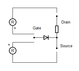 Das Ersatzschaltbild zeigt die Gate-Source-Diode und den Bahnwidderstand zwischen Source und Drain.  Das Ohmmeter kann auch ein Digitalvoltmeter  in Stellung Diodentester sein. (Wenn man ein analoges Ohmmeter verwendet, muss man beachten, das dort Minus rauskommt wo Plus dransteht.) Man testet das Gate gegen Source und gegen Drain. In beiden Fällen leitet der Transistor. Aber gegen Drain ist der Gesamtwiderstand geringfügig größer, weil der Bahnwiderstand hinzukommt.