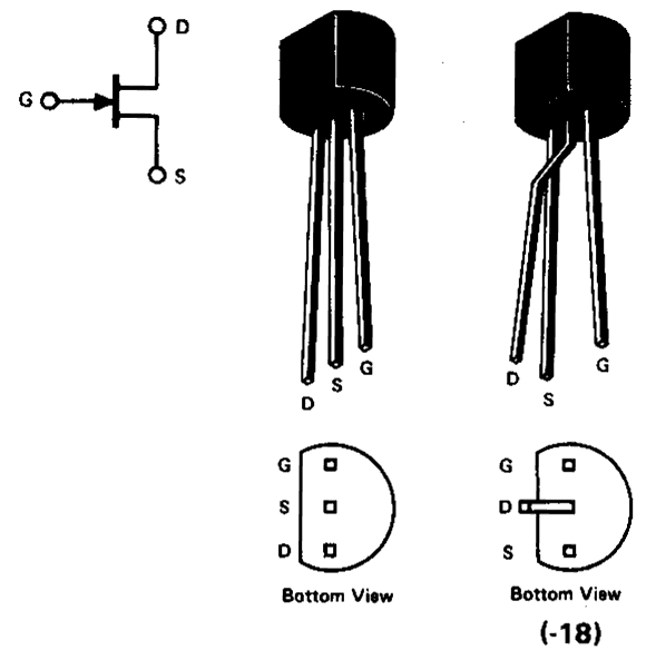 Man kann die Anschlüsse völlig gefahrlos mit einem Ohmmeter identifizieren. Der JFET ist auch nicht leicht durch statische Ladungen zu zerstören wie mache MOSFETs. Zum Test habe ich einen BF245 genommen, den es laut Datenblatt in zwei Versionen mit unterschiedlichen Anschlüssen gibt (Bild  aus einem Datenblatt von ON Semiconductor). Mit dem Ohmmeter kann man sehr leicht das Gate finden, weil es eine Diode darstellt.
