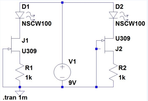 Der FET als Konstantstromquelle hätte helfen sollen Source und Drain zu unterscheiden. LTSpice sagt 'nö', kein Unterschied. Es war gerade nur ein J310 zur Hand. Weder das Ohmmeter noch das Tauschen von Source und Drain bei Konstantstrom zeigte einen Unterschied.