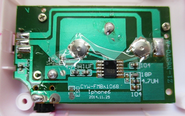 Die Schaltung ist gleich geblieben. Diesmal ist der Radio-Chip mit BK1068 beschriftet. Auf der Rückseite sind die Kontakte für die Lithium-Batterie.  An der Beschriftung sieht man, dass die Platine im November des letzten Jahres gezeichnet wurde. Interessant ist auch die Bezeichnung "Iphone6". Die Platine soll aber vermutlich kein schlechtes Plagiat des Iphone sein, sondern sie soll in das neue Gehäuse passen, das dem Iphone 6 nachempfunden ist. Daher die neue Größe. Apple dürfte sich geehrt fühlen. Und die Mädchen sind auch glücklich, denn man muss ja mit der Mode gehen. In Pink!