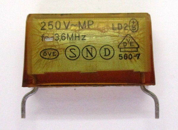 In der Bastelkiste lag dieser ältere Entstörkondensator mit 0,1 µF und