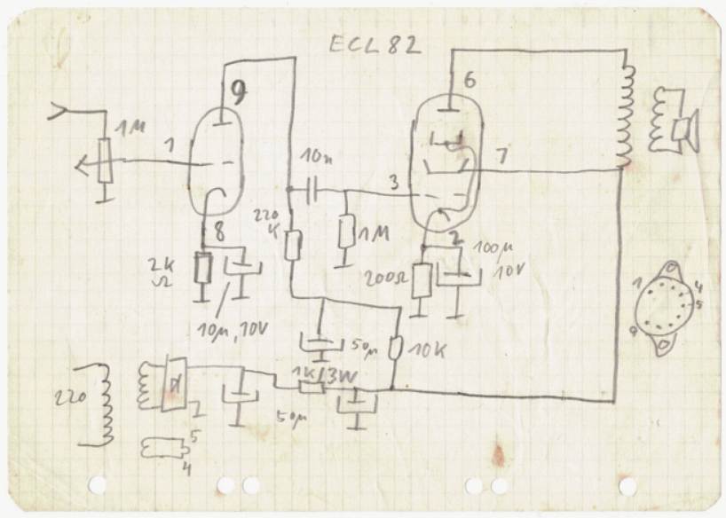 Mein Bruder hat mir ein paar alte Skizzen mitgebracht, die er in seinem Keller gefunden hat. Eine alte Bleistiftskizze habe ich sofort erkannt, das ist ja meine Schrift und mein Zeichenstil! Und das Blatt trägt deutliche Spuren des Lötkolbens, was darauf hinweist, dass die Schaltung wirklich gebaut wurde. Die Zeichnung muss ungefähr 50 Jahre alt sein. Ich erinnere mich noch dunkel, dass ich einen Röhrenverstärker gebaut habe, damit wir mit dem Tonbandgerät Musik hören konnten. Zu der Zeit war noch kein Gedanke an Röhren-Nostalgie, sondern das war die einfachste Möglichkeit, einen Verstärker zu bauen, und man kam auch leicht an die nötigen Bauteile heran. Die Schaltung selbst zeigt keine Besonderheiten. Nur die Siebkette ist nicht ganz optimal, weil ich wohl keine Drossel hatte. Der Verstärker hatte dann wahrscheinlich ein Watt weniger, aber es hat gereicht.