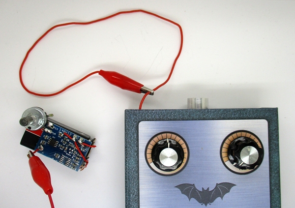 Eine in einem Garten verlegte Stromleitung sollte aufgespürt werden, und ich wurde um Hilfe gebeten. Die Leitung endet in einer Gartensteckdose, die noch funktioniert. Und die zugehörige Sicherung im Haus ist auch bekannt. Aber wo genau verläuft das Kabel? Auch die Tiefe im Erdboden ist nicht bekannt. Durch die Erde hindurch hindurch messen, das erinnert mich an den U-Boot-Funk im Bereich um 20 kHz. Da müsste doch der Fledermausdetektor als passender Empfänger funktionieren. Auf das Kabel wird ein Signal im Bereich 20...50 kHz gegeben, und der Fledermausdetektor bekommt eine geeignete Drahtantenne. Das Kabel zum Mikrofon wurde dazu vorübergehend abgelötet und an der Stelle ein Krokokabel als Empfangsantenne angeklemmt.