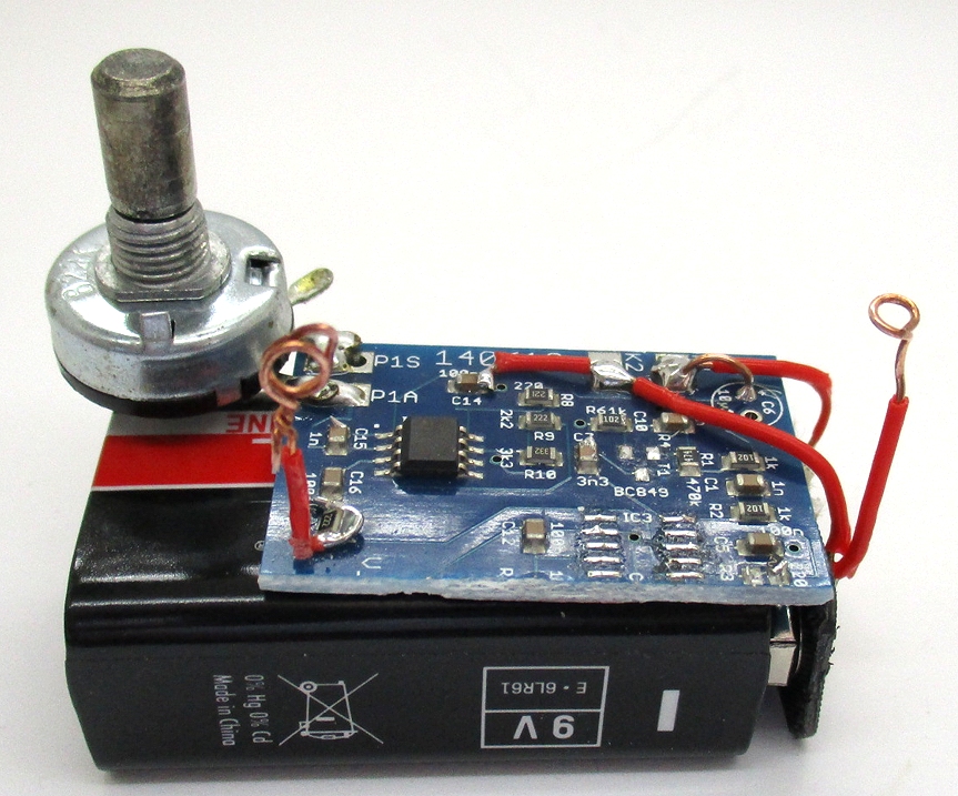 Der passende Generator dazu besteht aus einer halben Fledermausplatine mit dem NE555 und Poti-Abstimmung. Die andere Hälfte hatte ich kürzlich als Verstärker für ein Radio verwendet. Der Generator kann nun im selben Bereich abgestimmt werden wie der Detektor. Es gibt Anschlüsse für GND und Signal, wobei das Signal über 100 nF vom Pin 3 des NE555 kommt. Ein erster Test zeigte, dass zwei Kokokabel als Antennen eine Reichweite von 2 m brachten. Dann habe ich das Signal auf das Heizungsrohr gelegt und kann überall auch durch Wände hindurch verfolgen, wo die Heizungsrohre liegen.