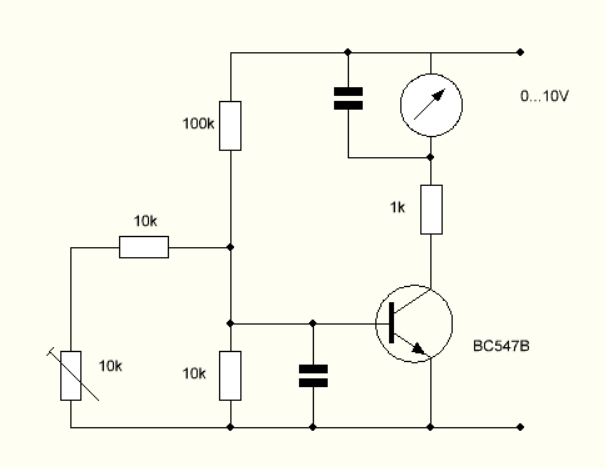 Ein NPN-Transistor mit einer definierten Basisspannung verhält sich wie ein fast ideale Stromquelle. Eine Faustregel der Elektronik lautet ja, die Basisspannung kann man mit 0,6 V annehmen. Das stimmt aber nur, wenn es um Kollektorströme in der Größenordnung Milliampere geht. Tatsächlich ist der Zusammenhang zwischen Basisspannung und Kollektorstrom ja über viele Dekaden streng exponentiell. Da gibt es auch wieder eine Faustregel: 20 mV mehr verdoppelt den Strom. An einem BC547B habe ich gemessen, dass etwas weniger als 60 mV den Strom um den Faktor 10 ändern. Und für einen Kollektorstrom von 1 nA brauchte ich ca. 260 mV an der Basis.