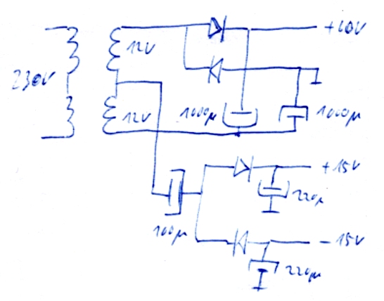 Dioden und Elkos konnten mit einem Trafo +60 V, + 15 V und - 15 V erzeugt