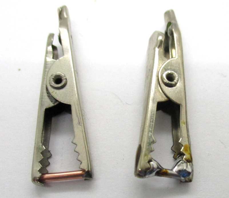 Krokoklemmen verwendet. Zuerst wurde ein kurzer, dicker Kupferdraht