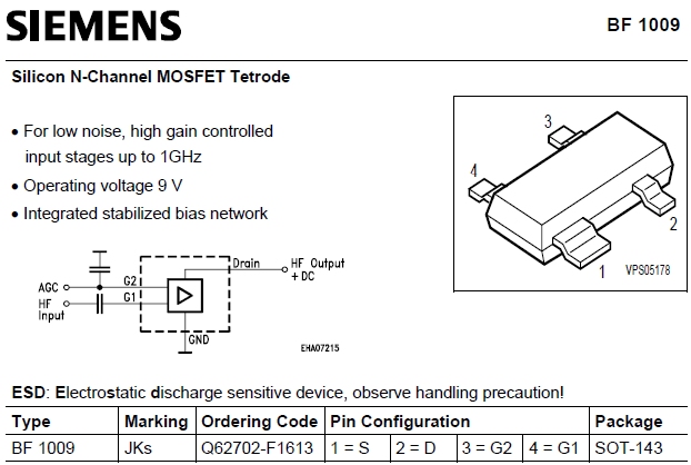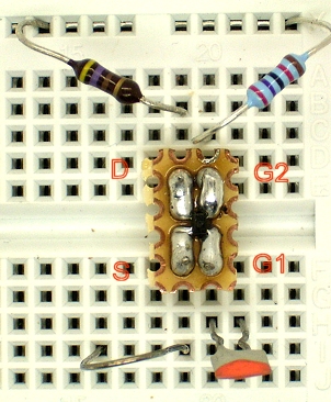 Diesen Transistor habe ich mir bei Pollin mitbestellt - weil er so preiswert war. Spannend finde ich die automatische Vorspannung am Gate 1 und die hohe Steilheit von 24 mS. Beim ersten Test hatte ich allerdings Probleme. Längeres Probieren förderte eine andere Pinorientierung als im Datenblatt zu Tage. Danach aber konnten die guten Werte bestätigt werden. Die G1-Vorspannung wird anscheinend automatisch auf ca. 1 V eingestellt, deshalb kan man ein Signal einfach mit einem Kondensator einkoppeln.
