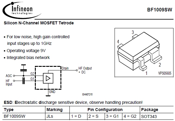 Ich hatte auch gerade das Vergnügen mit dem besagten Dual-Gate-MOSFET BF1009SW, allerdings in einem billigen Autoradio mit nur UKW, MW und einem USB-Anschluß für MP3-Sticks. Hier wurde dieser 3 mal verwendet. Einmal als HF-Vorstufe für UKW und einmal für MW sowie einmal in der ZF-Vorstufe. Interessant ist die Beschaltung in der ZF-Vorstufe. Anscheinend regelt diese Schaltung sich selbst nach und gibt zugleich die Signalstärke aus. Wie hoch diese ist, konnte nicht ermmittelt werden, da beim Messen mit dem Multimeter das Radio stummschaltet, egal ob bei UKW oder MW. Ich vermute daher, dass mein Multimeter zu niederohmig ist. Die Messleitung geht direkt zum maskenprogrammierten µC. Allerdings werden hier anscheinend nur die 455kHz verstärkt und jene mit 10,7MHz werden nur 1:1 durchgeleitet. Die zusätzlichen Transistoren arbeiten gekonnt mit dem BF1009SW zusammen und die gesamte Schaltung wird mit 8V betrieben.