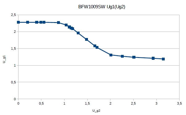 Mit dem Potentiometer wurde die an Giter 2 angelegte Spannung verändert und dabei die an Giter 1 anliegende Gleichspannung beobachtet. Tatsächlich zeigt sich ein Zusammenhang: bf1009sw_beobachtungen.pdf