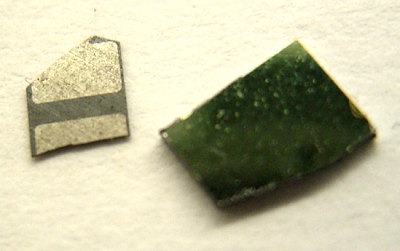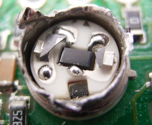Diesen Sensor wollte ich öffnen, um die Filterscheibe herauszunehmen. Das Ziel war, den Sensor als Bolometer für Leistungsmessungen in einem weiten Spektralbereich einzusetzen. Leider wurde der Sensor beim Öffnen beschädigt. Aber jetzt kann man gut sehen, wie er aufgebaut ist. Eingebaut ist ein Feldeffekttransistor ähnlich wie in einem Elektret-Mikrofon. Darüber war eine teilweise metallisierte Keramikscheibe angebracht, die jetzt zerbrochen ist. Durch kleine Temperaturunterschiede wird eine Spannung erzeugt und vom FET verstärkt. Das Prinzip habe ich schon mal in der ELO (Infrarotsensor im Eigenbau) beschrieben. Hinter der Gehäuseöffnung war eine Filterscheibe angebracht, die nur die passende Wellenlänge im Bereich um 10 µm durchlassen sollte. Hier sieht man links die Sensorscheibe und rechts einen Teil der Filterscheibe.