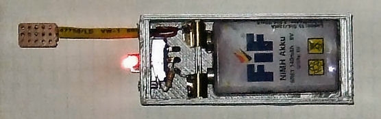 ist in einem gedruckten Gehäuse, zwei Messingstreifen sind die Kontakte