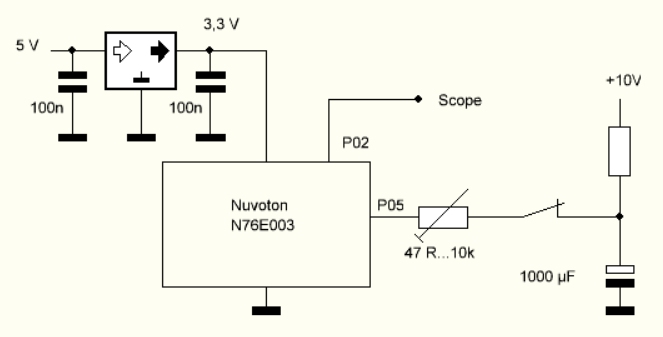 einen Widerstand auf den Port P02. Am Oszi sehe ich, dass die Betriebsspannung