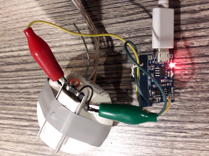 Krokodilklemmen. Auf dem Foto lade ich gerade den neuen Akku (auch von