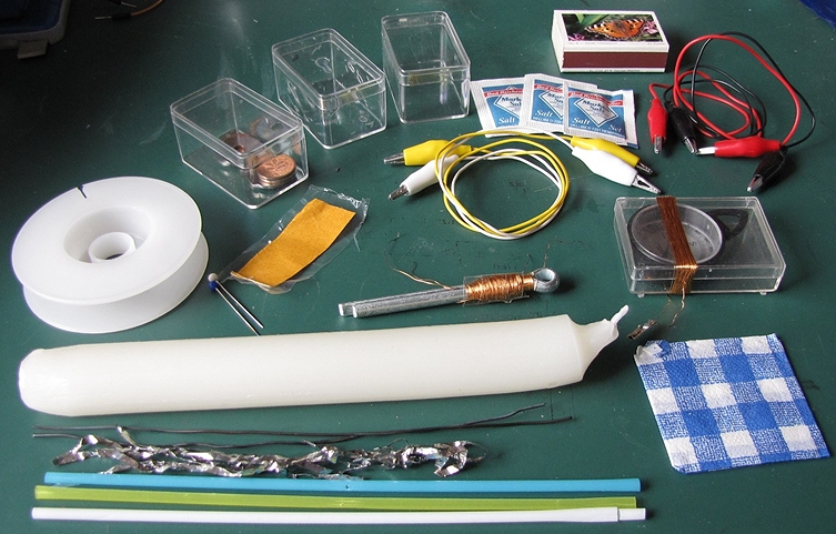alle notwendigen Versuchsmaterialien von der Streichholzschachtel über