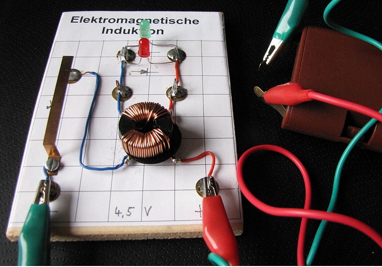 Abb. 7: Versuch zur Induktion nach Faraday mit einem Ringkerntransformator und zwei Leuchtdioden