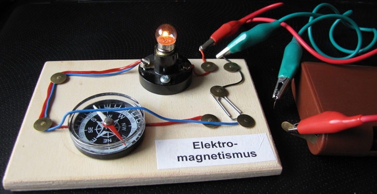 Abb. 8: Versuch zum Elektromagnetismus nach Oersted mit Kompass und Glühlämpchen