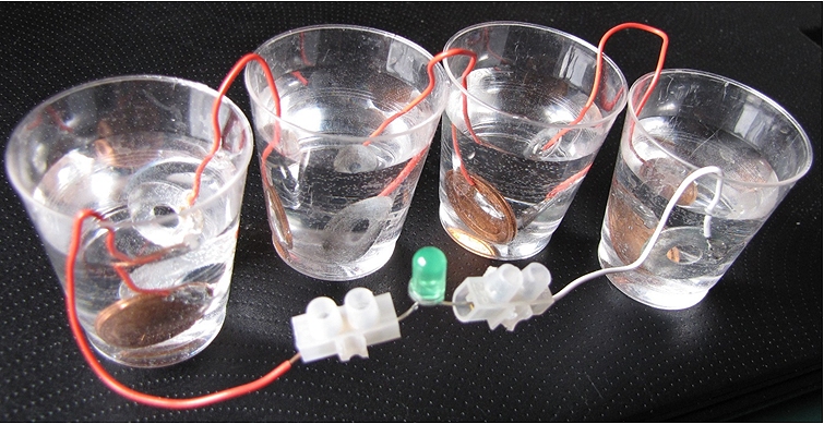 Abb. 9: Versuch zu galvanischen Elementen (Tassenkrone) nach Volta mit Stromnachweis durch eine Leuchtdiode