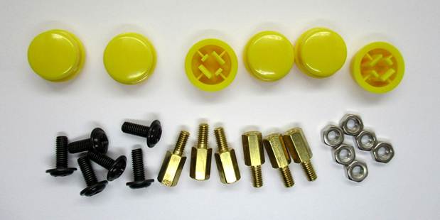 Abstandshalter, Schrauben und Muttern. Die gelben Knöpfe passen auf die