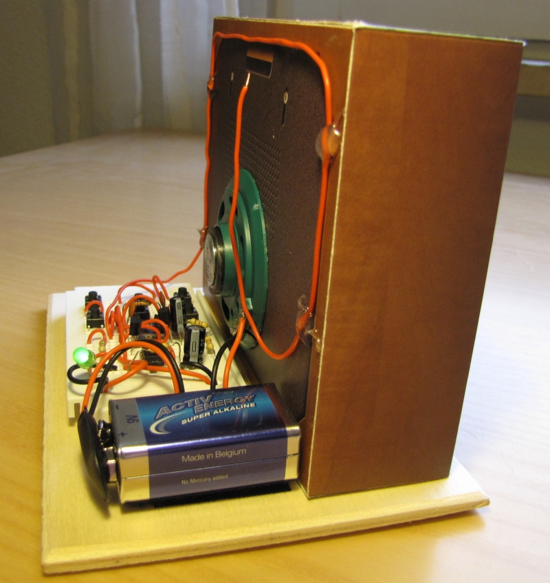 „Breadboard-Aufbau“. Die Steckplatine und die Lautsprecherbox können