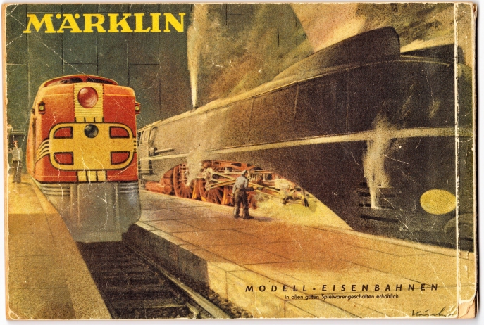 Rückseite wirbt für Modell-Eisenbahnen und zeigt einen Bahnsteig mit
