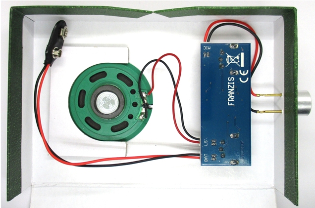 Lautsprecher und der Batterieclip. Zu jedem Bauteil gehört ein