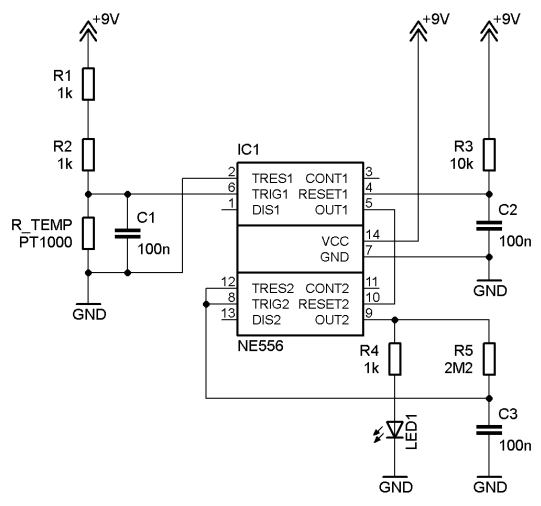 dieser Schaltung wird der erste der beiden im NE556 integrierten NE555