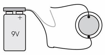 Verbinden Sie die Batterie kurz mit dem Piezo-Schallwandler. Es knackt, aber nur einmal. Beim nächsten Anschließen ändert sich die Spannung nicht mehr. Der Wandler bleibt aufgeladen und hält seine Spannung von etwa 9 V. Drehen Sie dagegen die Batterie jeweils um, dann knackt es etwas lauter. Die Spannung ändert sich zwischen +9 V und -9 V, also um insgesamt 18 V. Sie können den Wandler auch entladen, indem Sie beide Drahtenden berühren. Danach ist wieder das Knacken zu hören, wenn Sie die Batterie anschließen.