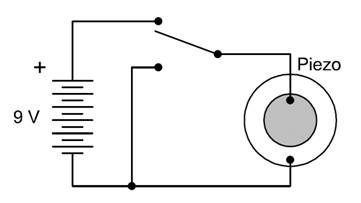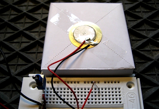 Die ersten Versuche erzeugen Knackgeräusche mit einfachsten Mitteln. Der Piezo-Schallwandler allein gibt noch kein sehr lautes Geräusch ab. Man kann aber ein Stück Karton oder Papier als Membran verwenden oder das Plättchen auf eine Tischfläche drücken. Damit wird das Knacken lauter.