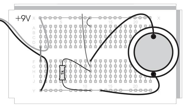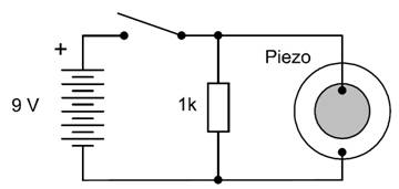 Setzen Sie den Widerstand parallel zum Schallwandler ein. Bauen Sie außerdem einen einfachen Schalter aus zwei Drähten. Mit jeder Berührung der Drahtenden hört man nun ein Knacken. Immer wenn der Schalter geöffnet wird, entlädt sich der Kristall des Piezo-Schallwandlers über den Widerstand. Das geschieht relativ schnell. Deshalb hören Sie auch beim Öffnen des Schalters ein etwas leiseres Geräusch.